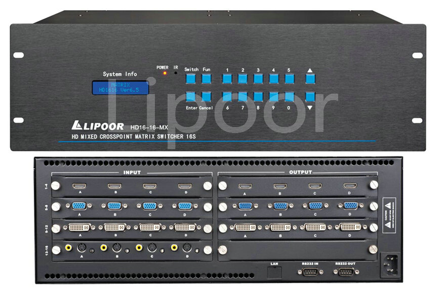 Hd modular hybrid matrix is a high-performance hd audio and video signal switching equipment, supporting 4 ~ 32 channels signal input, 4 ~ 32 channel signal output. Products one of the biggest characteristic is to support a variety of video formats signal input, can be used for multiple high-definition digital signal input, output, exchange, any all the signal output are free to choose any signal source and the output of the not interfere with the other all the way, make the signal transmission attenuation, fell to a low to high fidelity graphics and sound signal output. Hd mixed matrix host, support up to 32 road input and output, input and output can be any combination.