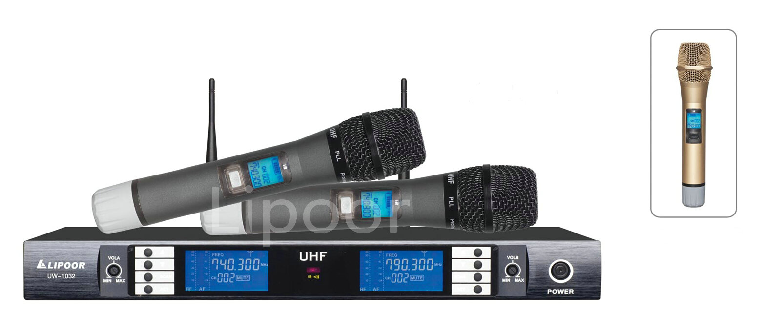 UW - 1032 for automatic frequency for 2 channel wireless microphone, with less noise interference of UHF frequency band PLL phase locking technology, with functions of automatic frequency sweep frequency selective, hand-held metal drop excellent results. Microcomputer CPU control, secondary frequency conversion technology, sound reduction degree is high, 200 channels to choose from. Regardless of the channel, it is more convenient to use. Suitable for high-grade KTV, professional stage speech, conference, install and use the club.